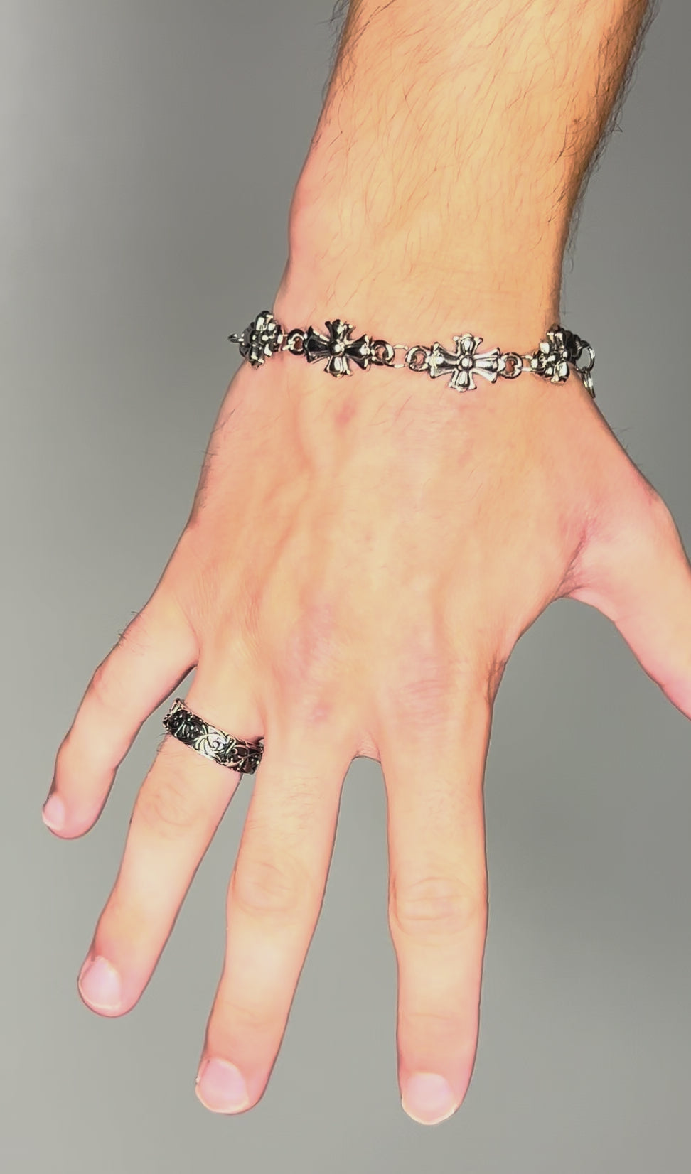 Unite two bold statements in one powerful bundle. This set pairs the intricately detailed chrome ring with the matching linked bracelet, creating an unmistakable look of gothic elegance and rugged style.